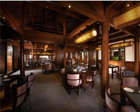 沒有繼續(xù)延續(xù)內室的宮燈使用,而是別出心裁的使用描紅紙傘來對內室做一番裝飾點綴,如此別出心裁的設計,可見設計師的非凡設計功底,懸吊在半空中的群傘裝飾,不僅有效的將內室空間等比例分割開來,更是為內室營造出一種別致的婉約美感,仿佛是那青石板上想起的零丁聲響,自那暈開的水滴之間,恍然見到一俏麗女子模糊花顏,巧笑倩兮,美目盼兮,顧盼之間蕩出的是千年凝萃的詩畫風流。
