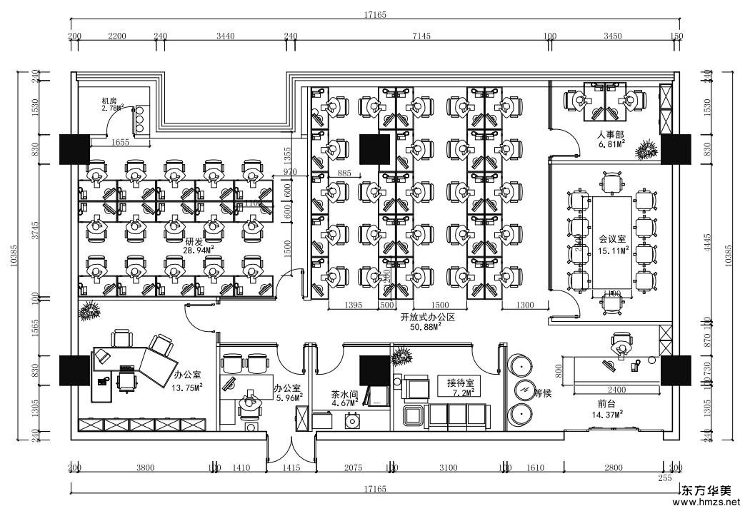 ▄原建筑結(jié)構(gòu)分析: 總經(jīng)理辦公室、財(cái)務(wù)室和一些特別的會(huì)議室外,建議采用全通透或者半通透的隔斷,這樣可以增加企業(yè)融合力和方便交流,也便于員工互相監(jiān)督。在裝修設(shè)計(jì)中要突出重點(diǎn)區(qū)域,抓住幾個(gè)關(guān)鍵點(diǎn),例如前臺(tái)、會(huì)議室、總經(jīng)理辦公室等空間。要盡可能少地采取大的裝修結(jié)構(gòu)和造型,多用燈光和色彩以及現(xiàn)代化的配飾組合取得良好的裝飾效果。