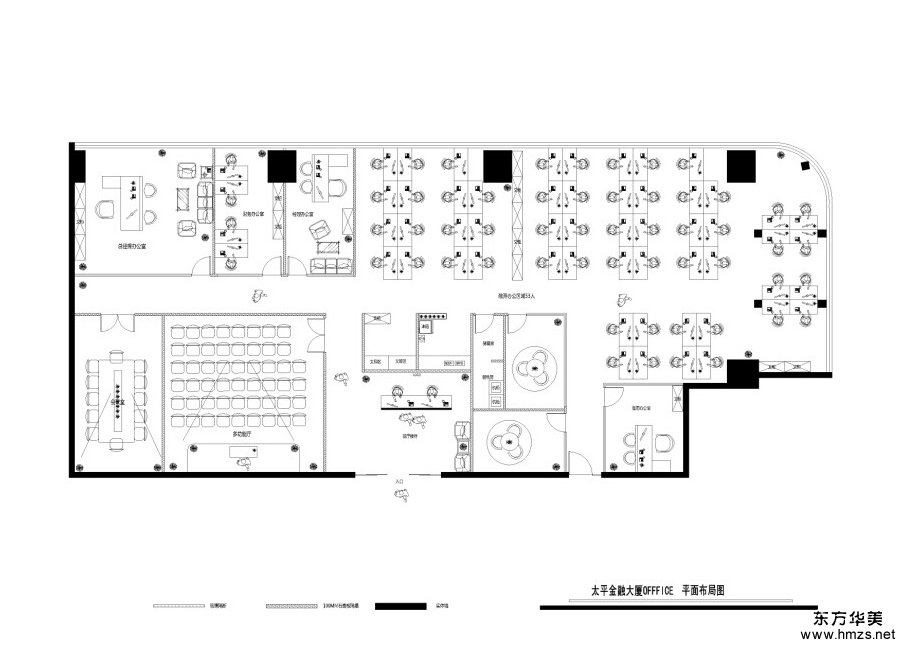 ▄設計風格定位: 本項目在風格設計上以現代為主,要求穩重、大方、寬敞、明亮,頂面采用鋁格柵吊頂、格柵燈等材料,使整個空間即簡約又寬敞明亮,在設計空間布局上,疏密有致,符合投資理財公司的空間布局,體現公司高效通透,以人為本的人性化管理。此項目前臺設計的偏新中式風格,背景墻使用木紋格柵和仿石材,開放性辦公區沿用了前廳的鋁格柵吊頂、格柵燈等材料,整個空間疏密有致。 前臺背景墻的背面也立于開放性辦公區內,此面墻用作于企業精神文化墻不僅宣傳了公司企業文化,也起到了裝飾作用。